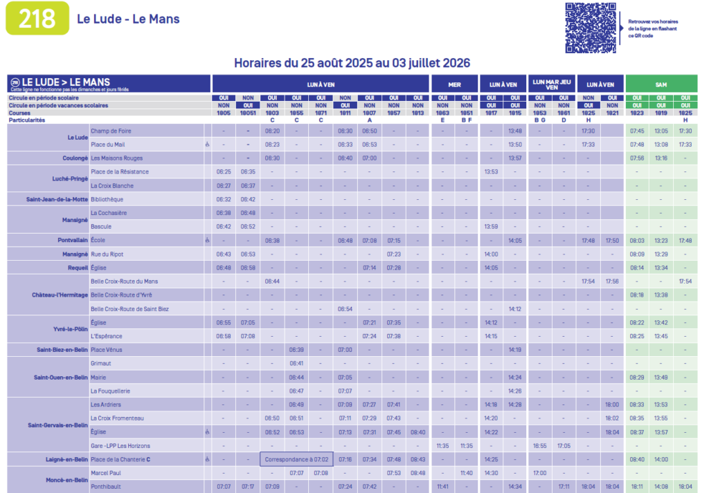 La ligne 218 dessert notre commune (Le Lude – Le Mans)